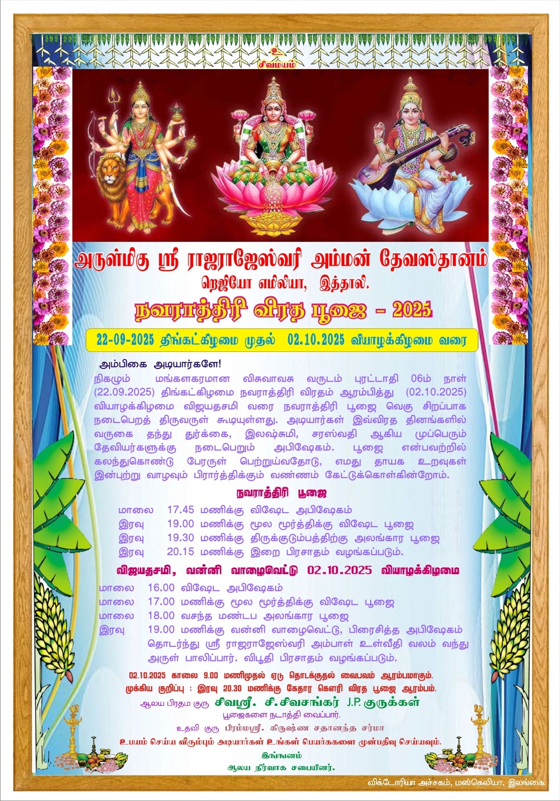ஸ்ரீ ராஜ ராஜேஸ்வரி அம்பாள் ஆலயத்தில் நவராத்திரி தின விழாவை முன்னிட்டு சிறுவர்களுக்கான கலை நிகழ்ச்சிகள் நடைபெறுவது என்பது யாவரும் அறிந்ததே !ஆகவே நிகழ்ச்சியில் பங்கு கொள்ளும் சிறார்கள் (18 வயதுக்கு உட்பட்டவர்கள்) தனியாகவோ ? குழுவாகவோ ?ஒரு நிகழ்ச்சியில் மட்டுமே பங்கு கொள்ள முடியும்.